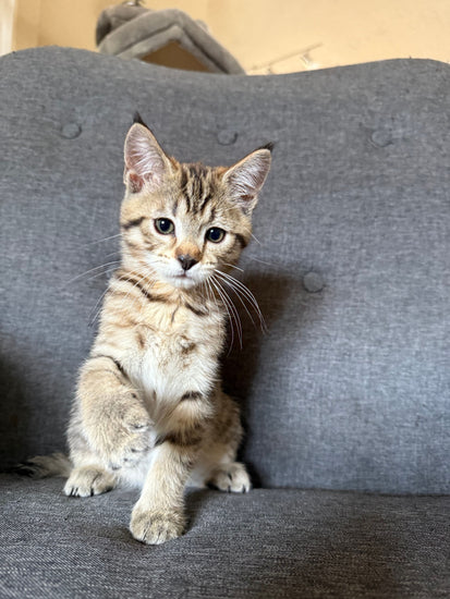 Meet Porsche - our charming female Pixiebob kitten with a heart as wild as her look! Porsche has a sleek, short-haired coat that shows off her beautiful ticking and warm tones, giving her that true bobcat -inspired look. Her medium-length kinked tail adds just the right touch of personality, and her straight toes give her a graceful athletic stance